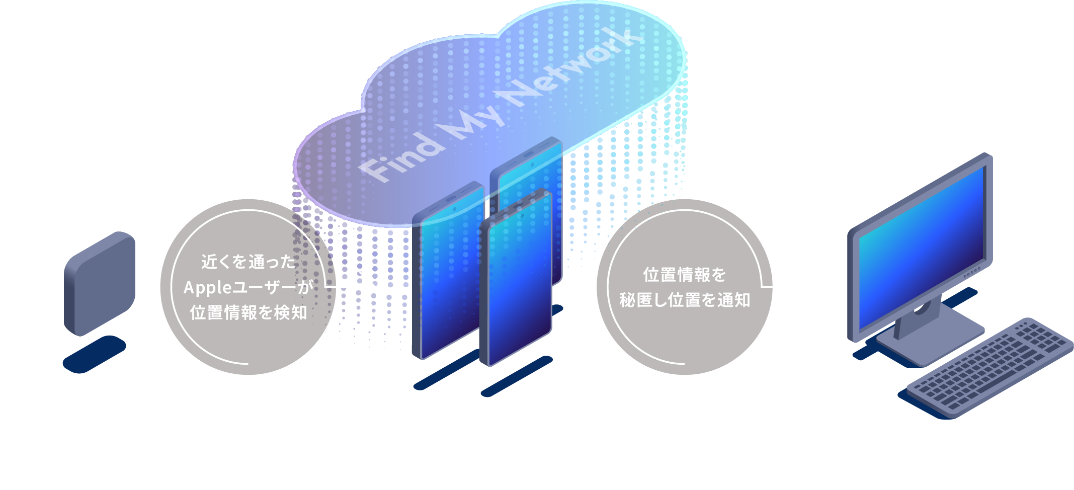 Bluetoothトラッカーが2秒ごとに発信する信号を、「世界中のAppleデバイスがすれ違い通信」で検知し、暗号化された位置情報をクラウドへ送信します。