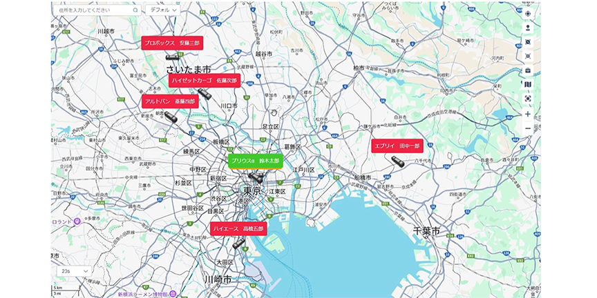営業所・拠点ごとのグループ管理やエリア指定検索機能、航空写真・渋滞情報への地図切替にも対応し、現場判断を支え、業務効率と対応力を高めます。