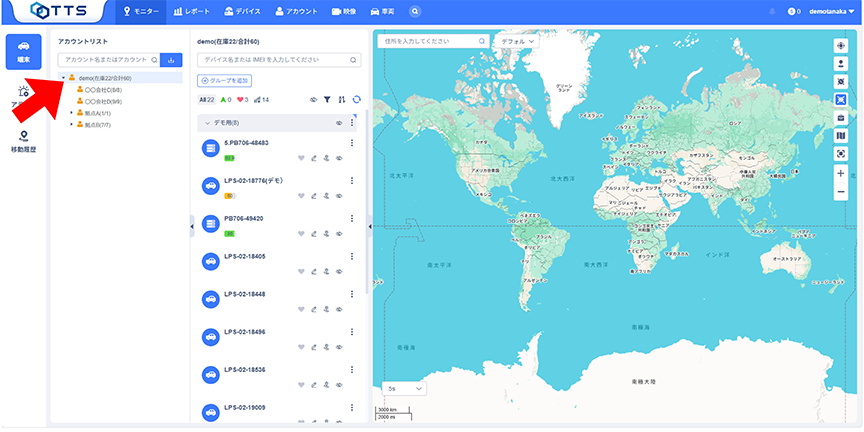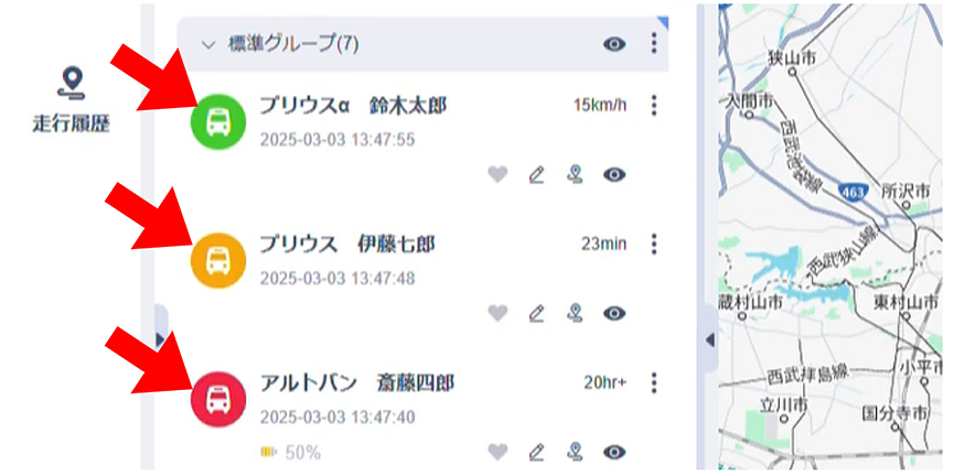 複数のGPS機器やBluetoothタグをひとつの画面で一元管理し、状態を色分け表示で直感的に把握。