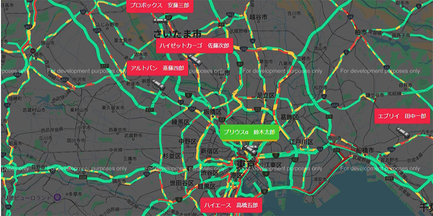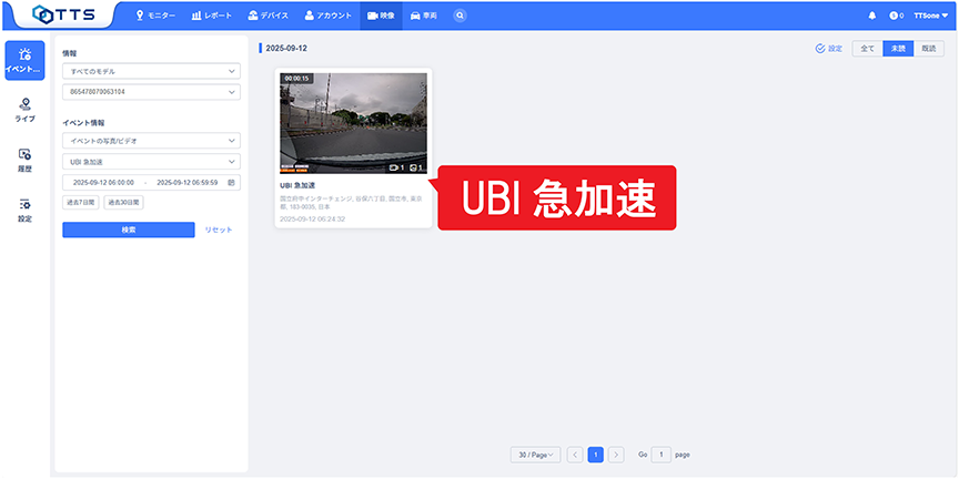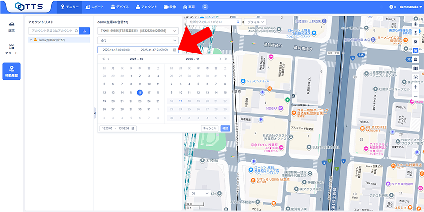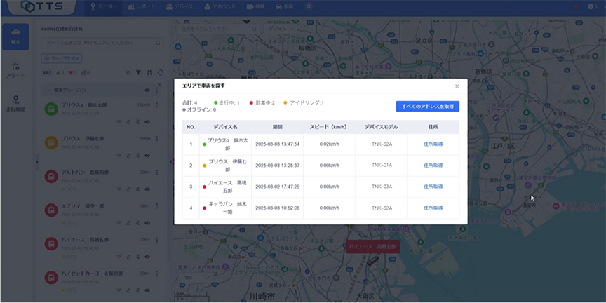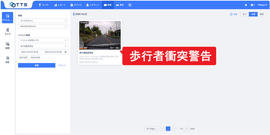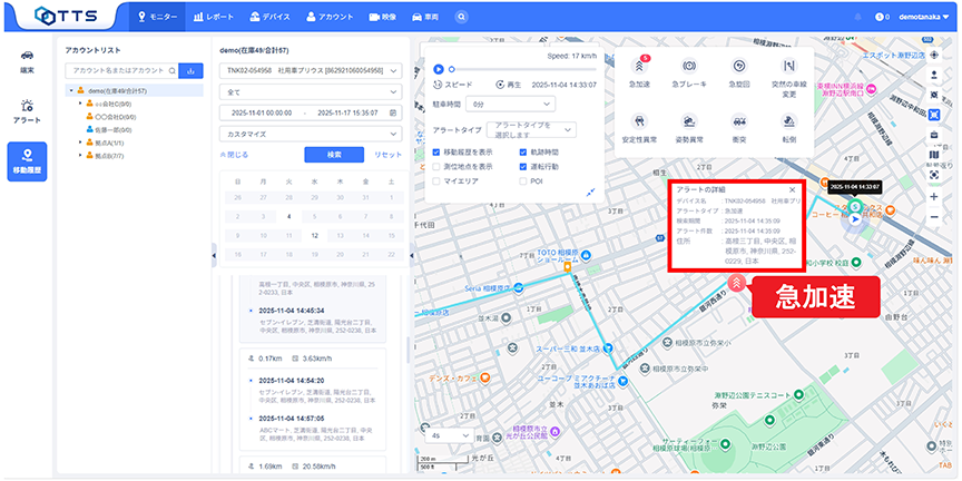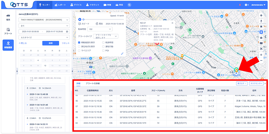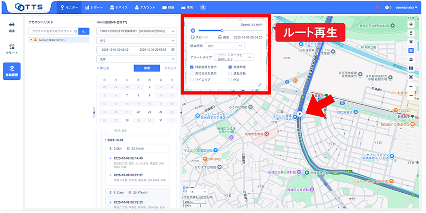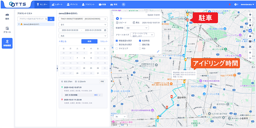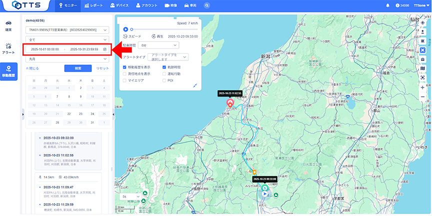 TTSプラットフォームは、最大6ヶ月分の走行履歴を記録・保存。日時・車両ごとの走行ルートを簡単に検索・再生できるため、ルートの最適化や稼働効率の分析、トラブル発生時の事後確認が可能です。