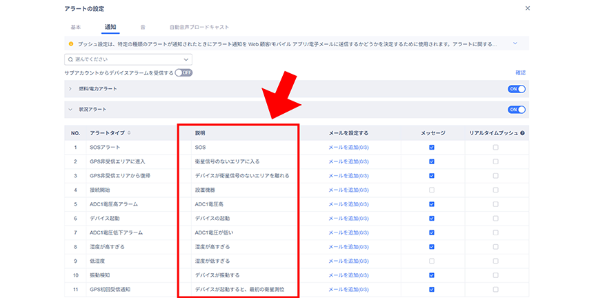 GPS機器ごとにカスタマイズ可能なアラート条件を設定でき、エリアの出入り・速度超過・本体の取り外し・バッテリー低下など多彩なケースに即対応。
