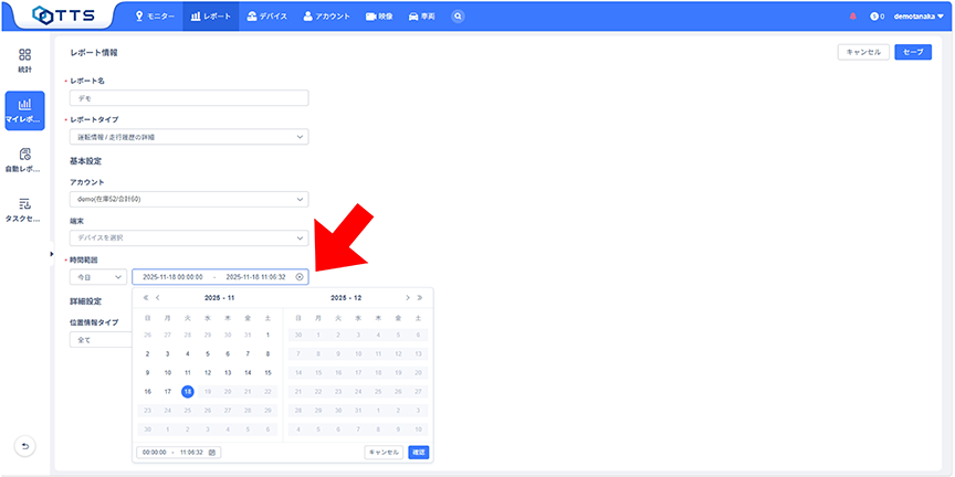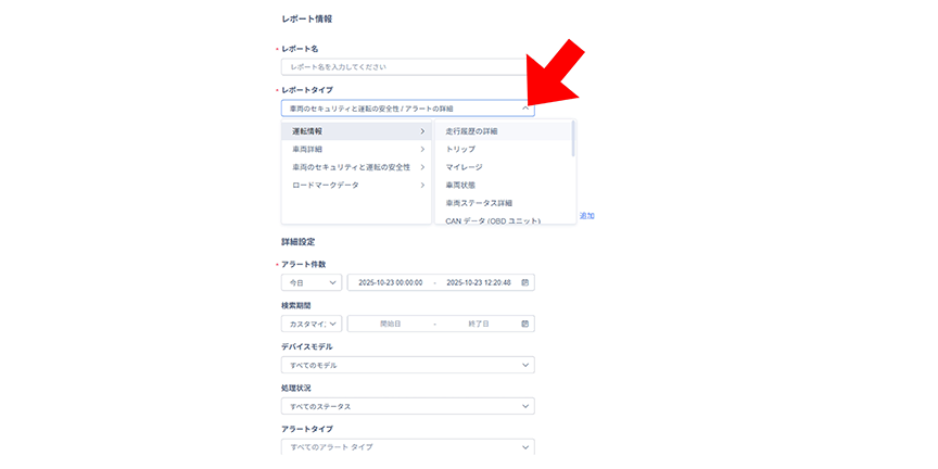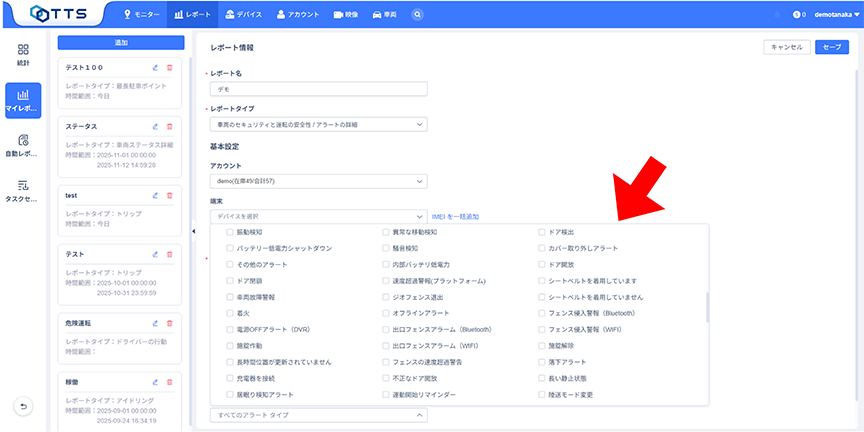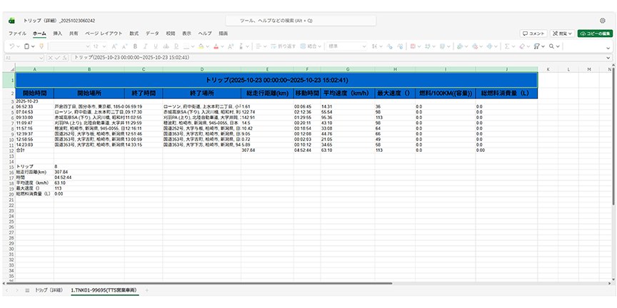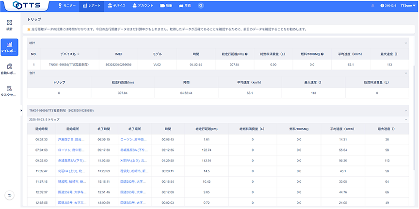 TTSプラットフォームのレポート機能は、走行距離・時間・出発地・危険運転回数などの運行データを、自動で収集・整理・出力。