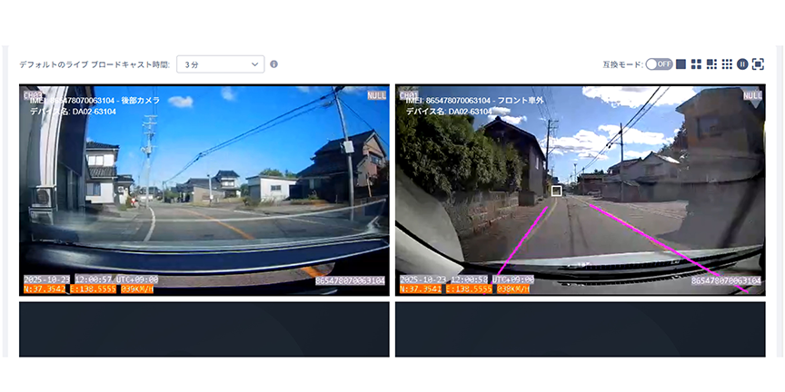 AIを活用したドライバーモニタリングシステム(DMS)。ドライバーが走行時のよそ見や居眠り、シートベルト等様々なヒヤリハットに繋がる行為を検知。自動音声によるドライバーへの注意喚起機能にて安全運転意識向上へにつながります。